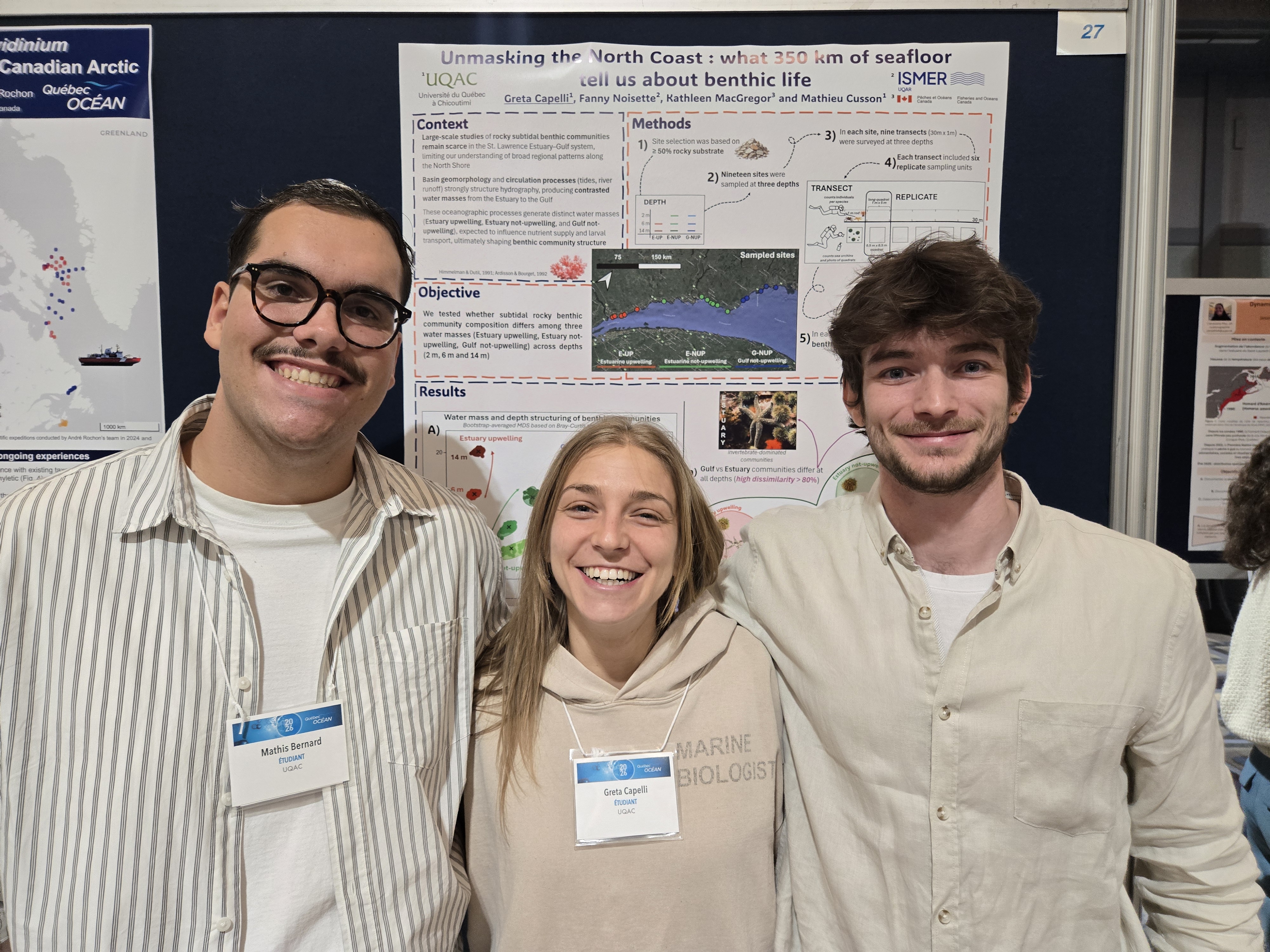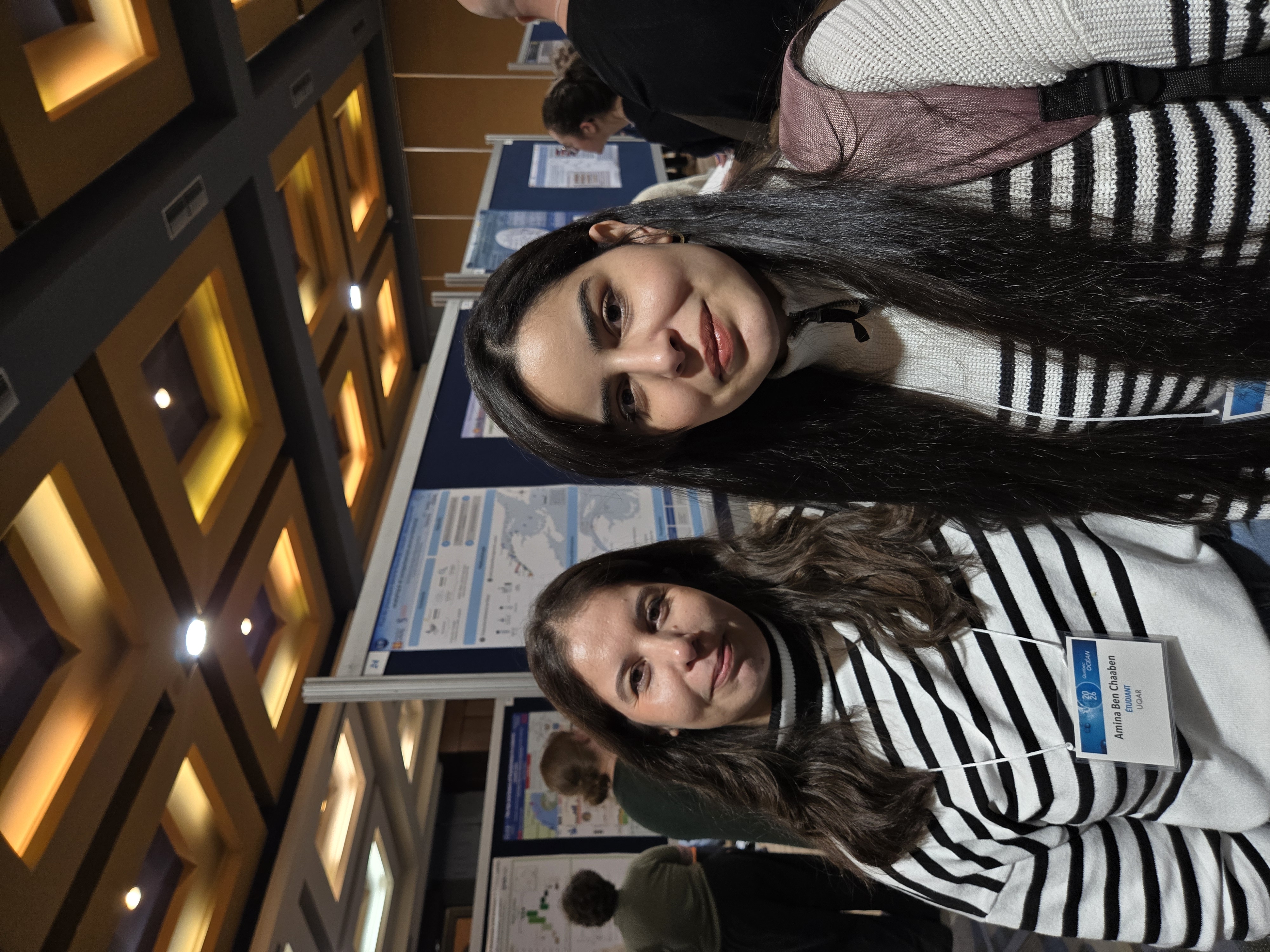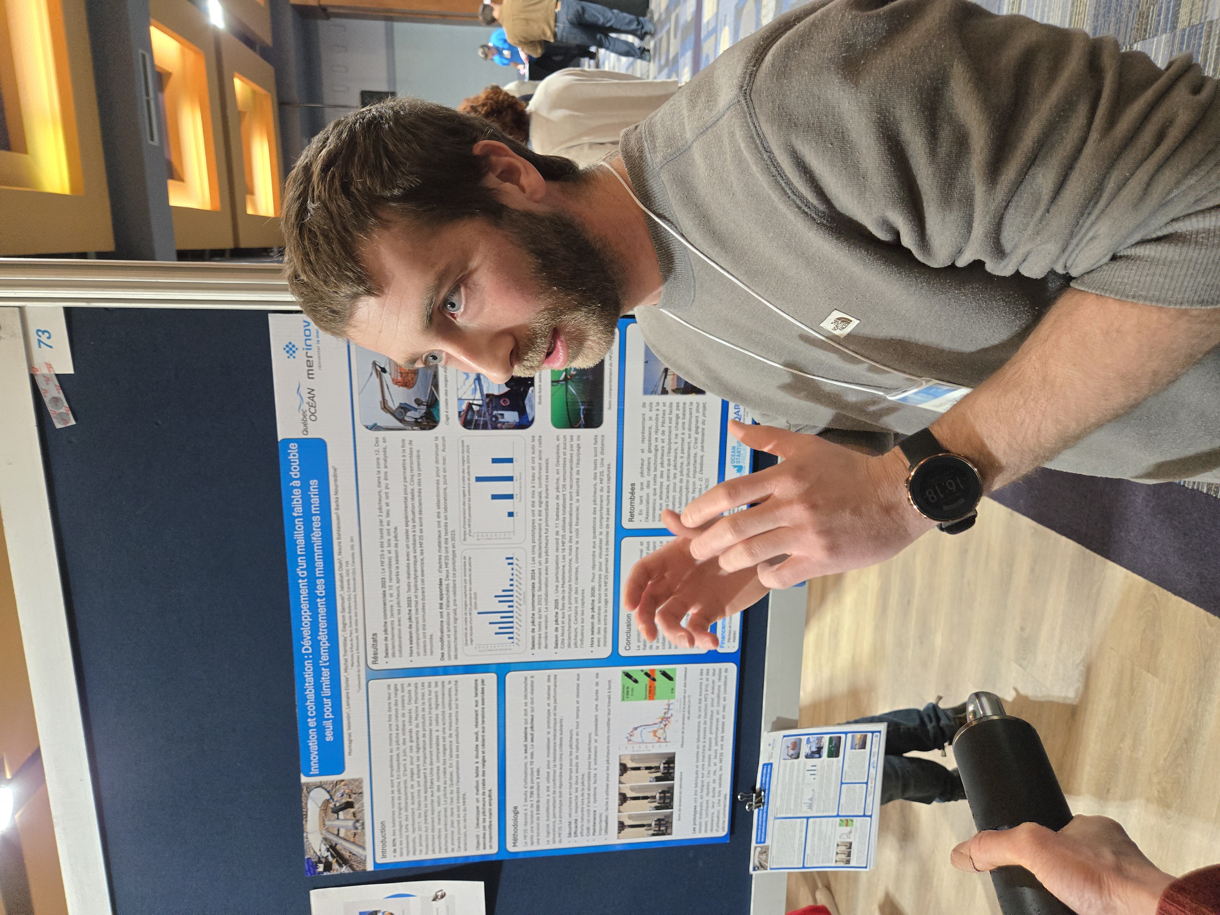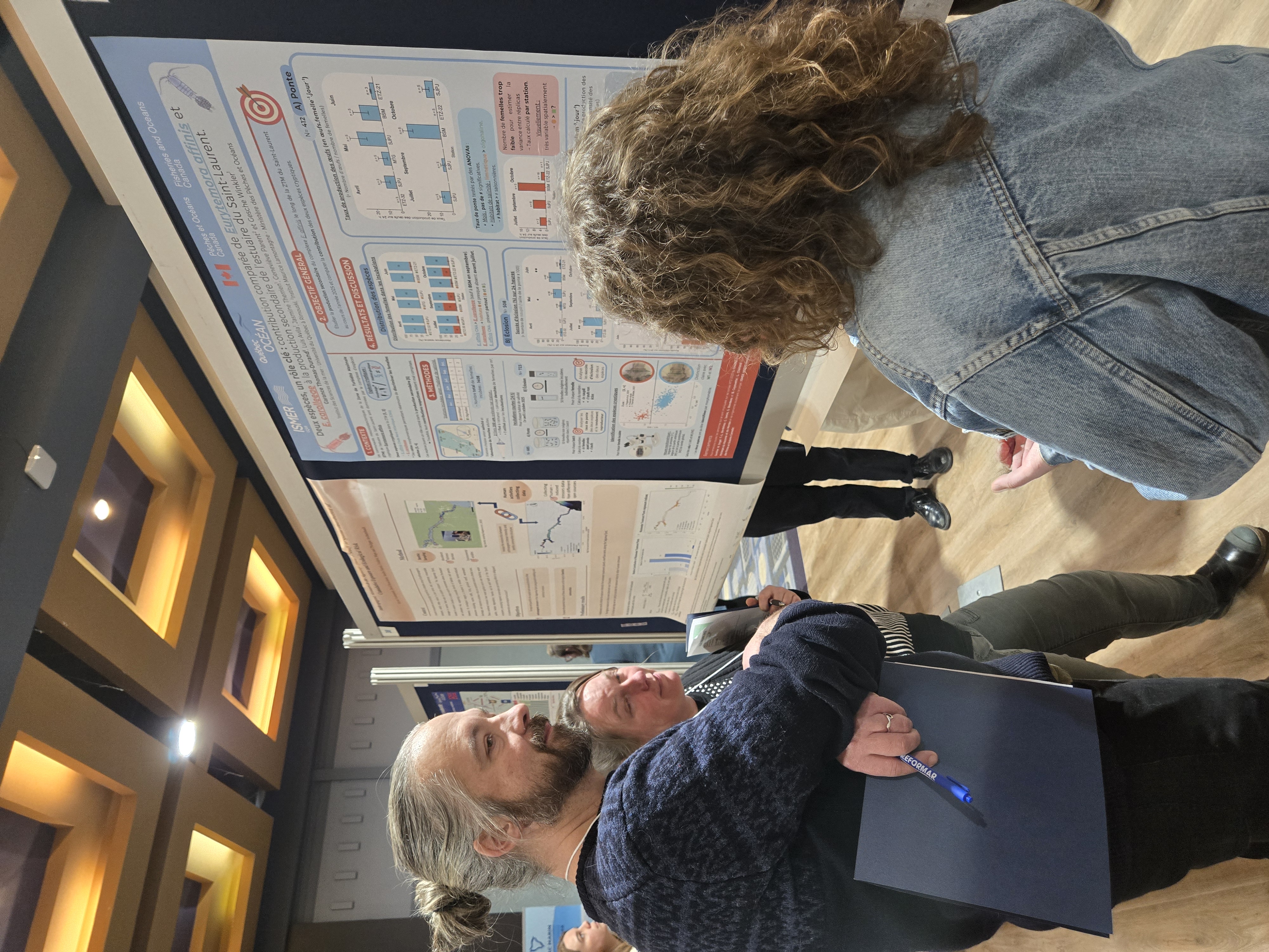 À gauche, Valentin Montagnac, en visite de chez Merinov - Nos étudiant(e)s Amina, Zineb (ISMER-UQAR) - À droite, notre étudiante Garance (ISMER), pendant l'évaluation de son affiche au concours, en compagnie de nos juges David Pelletier et Cindy Grant.